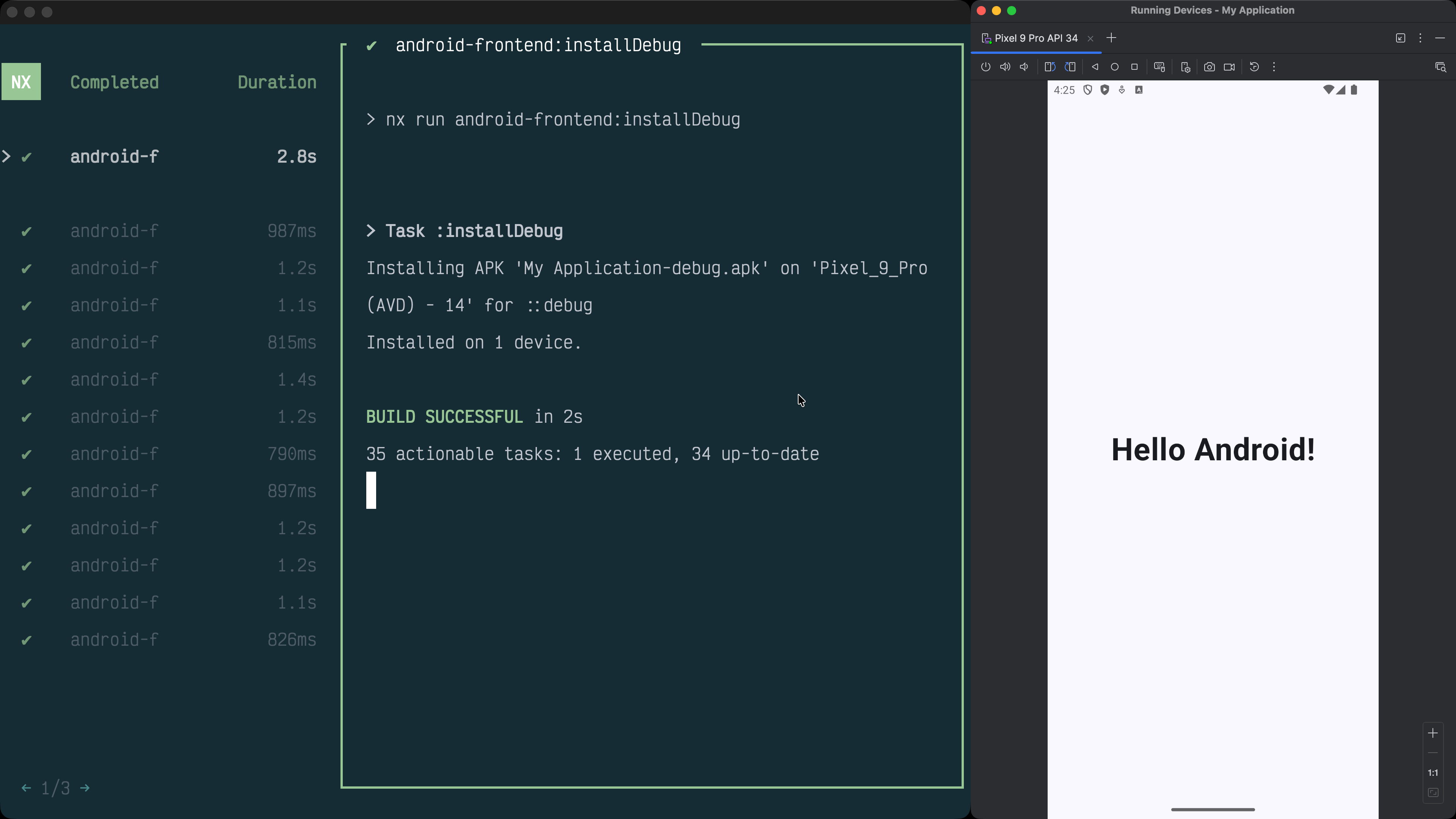 And that's it! It might seem not that impressive, but in the future, there could hypothetically be a dedicated Nx Android plugin that could handle starting your emulator and deploying your app. This could build on the Nx Gradle plugin and really help Android developers work more closely with their colleagues on the web team. We got one last blog post this week for our Java developers, so be sure to check back tomorrow and we'll get our app shipped 🚀.
